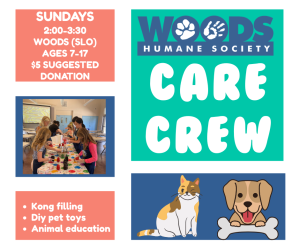 Calling all crafty, caring, pet-loving kids! Care Crew members age 7-17 will have the opportunity to join us in filling Kongs for our canines to enjoy in their kennels, crafting homemade pet toys, and creating art to help showcase our adoptable animals. Care Crew will be held at our San Luis Obispo location on Sundays at 2:00-3:30. This will be an ongoing program, but space is limited so sign up below!