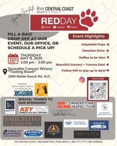 Join Keller Williams' RED Day, an annual day of giving back to the community, on Thursday, May 8 from 1-3 p.m. at Saucelito Canyon Winery Tasting Room. Meet adorable pups, bring a donation of wet/dry dog food, jerky treats, pill pockets or dog toys, and enjoy a beautiful setting and yummy bites. Saucelito Canyon is located at 3080 Biddle Ranch Rd., San Luis Obispo.