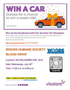 On July 30th, we are partnering with our friends at Vitalant to host a blood drive at Woods Humane Society in San Luis Obispo open to staff, volunteers and the public from 11 a.m. – 2 p.m. As you gear up for summer fun, help hospitals get ready for summer blood needs. Your blood donation helps ensure patient care won’t be delayed. All donors will receive pizza and a t shirt and you might as well meet some adoptable animals while you are here!