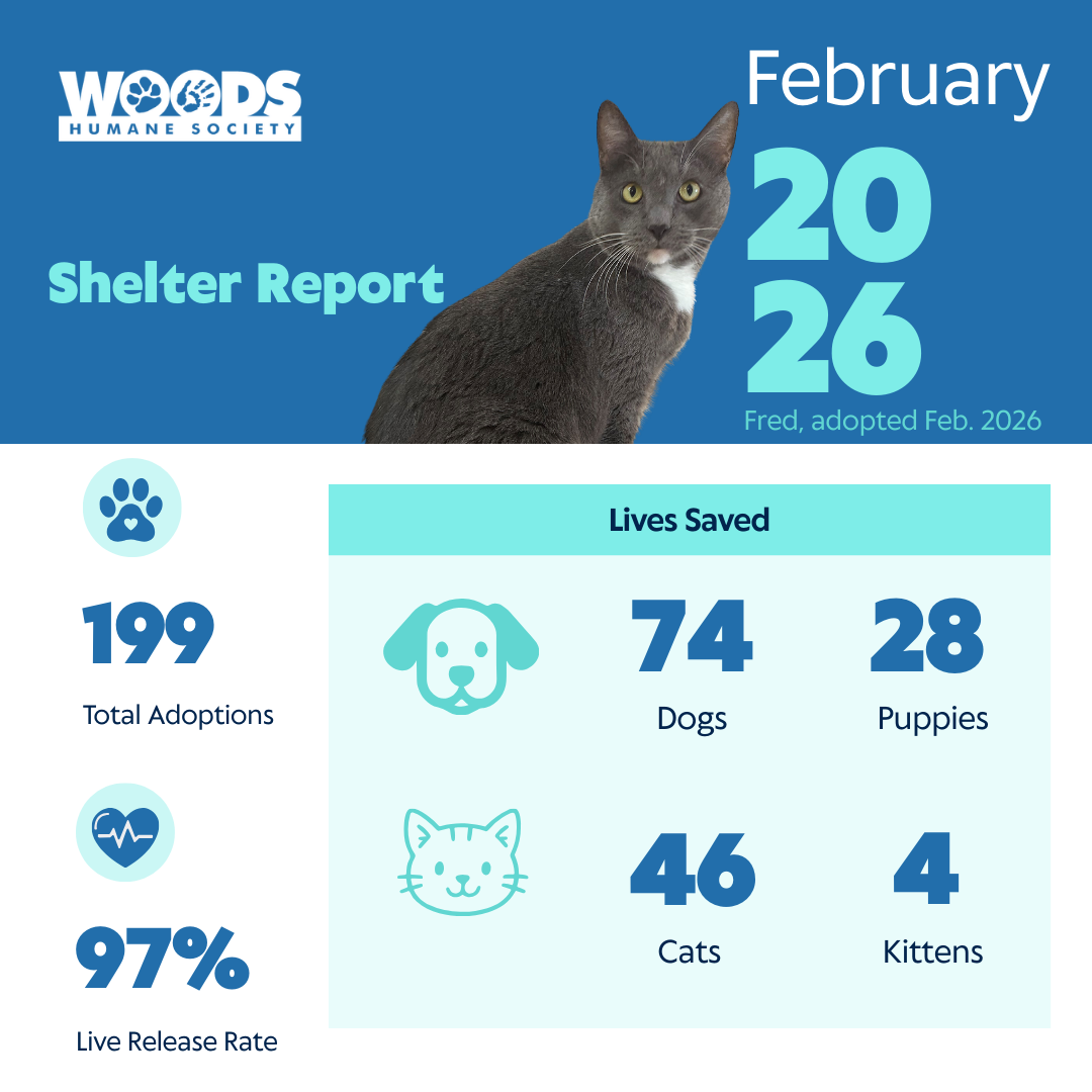 February 2023 - Woods Humane Society Reduces Adoption Fees to $14 through Valentine's Day